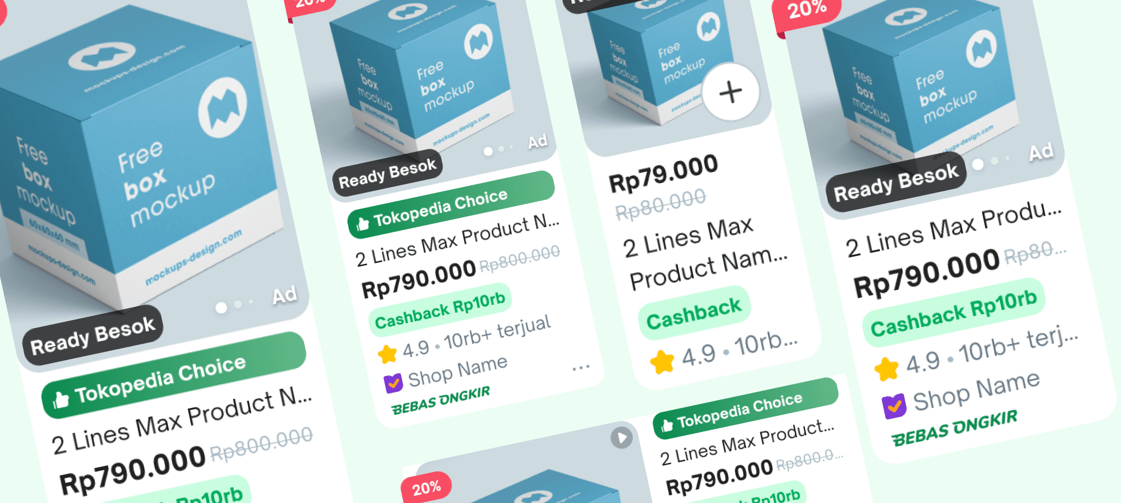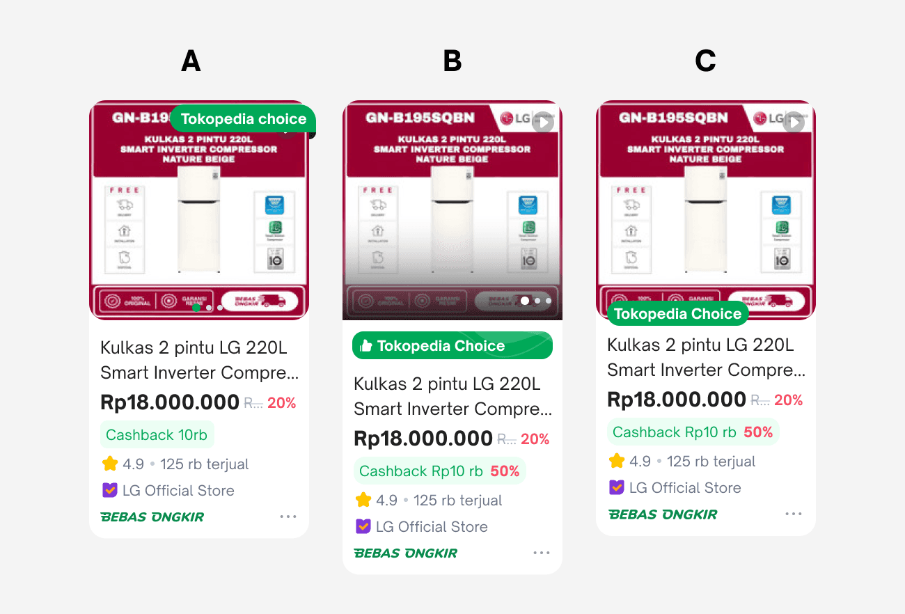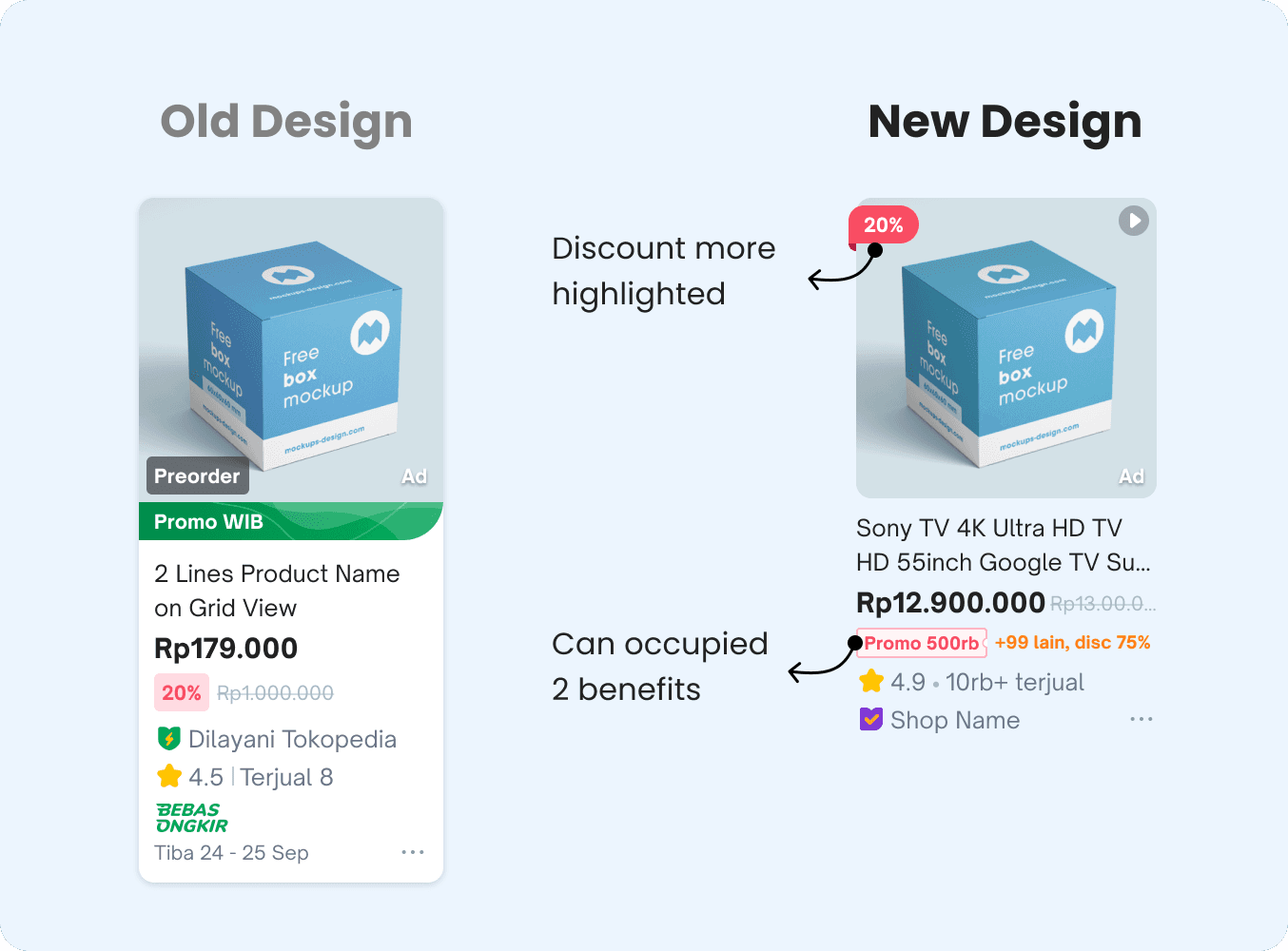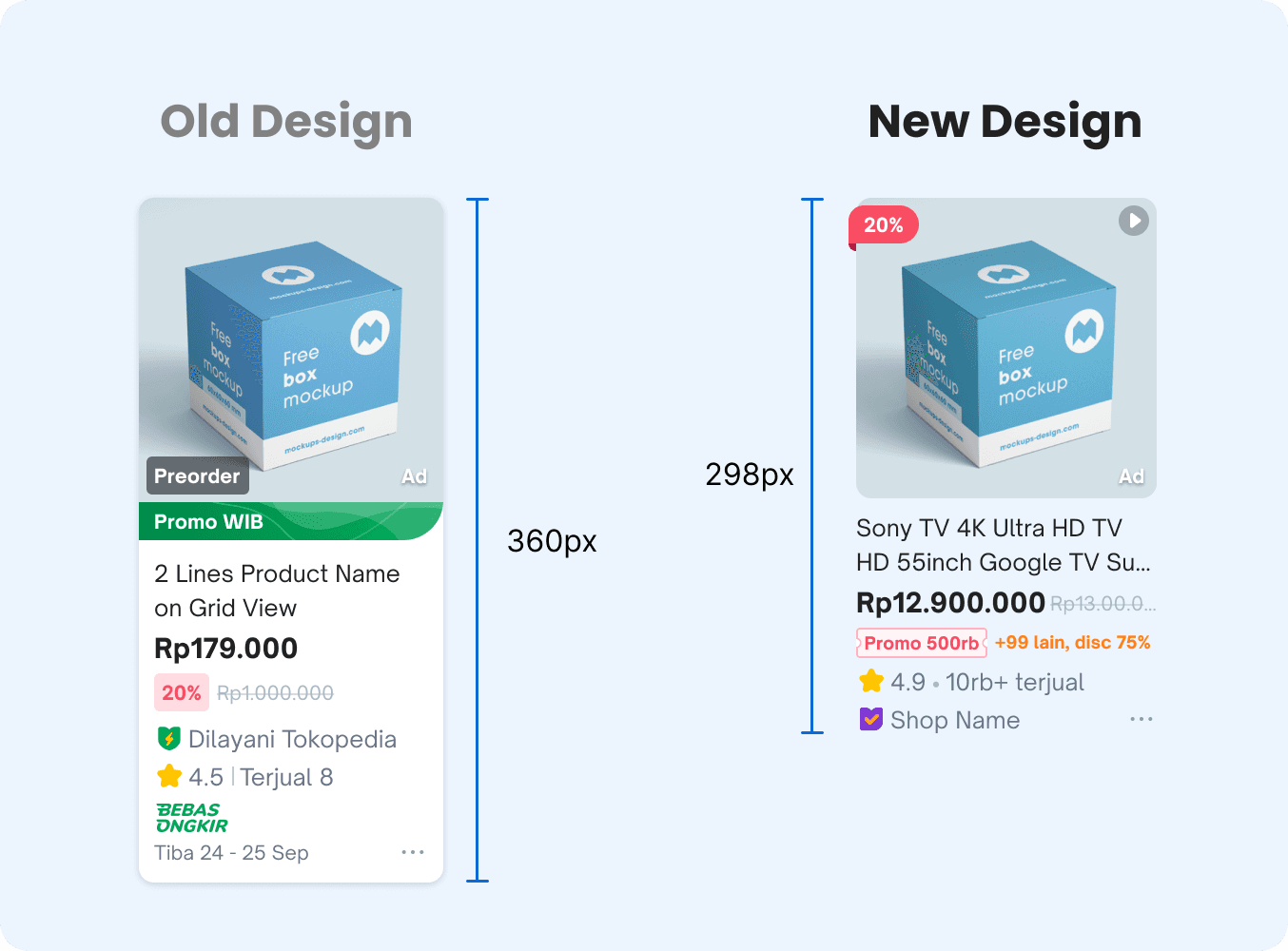 After extensive design iterations and collaborative discussions with other teams, we finalized a refreshed design for Tokopedia's product cards. This update introduces a modernized style, refined terminology, and improved logic to enhance both functionality and user experience.
